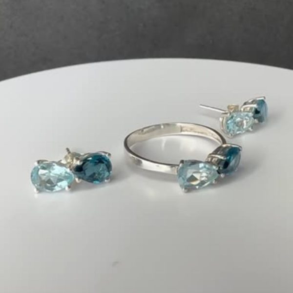 Elegancia y el brillo de  unido en este extraordinario conjunto de pendientes de plata de primera ley, adornados con dos deslumbrantes circonitas: una en un hermoso tono azul aguamarina y otra en un azul más oscuro y  pendientes iguales.